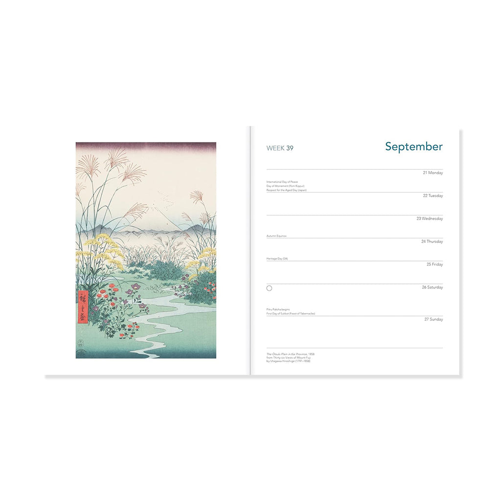 This 2026 diary showcases a stunning collection of woodblock prints by renowned Japanese artists. Experience a breath-taking display of rocky cliffs, natural wonders, and mountainous landscapes, all rendered in a dazzling style with vibrant colours.