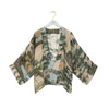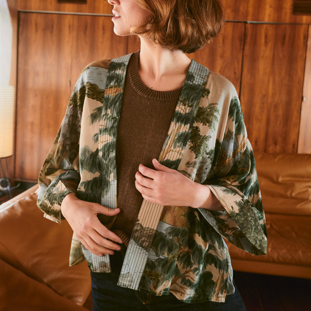 This gorgeous kimono depicts hand drawn illustrations of different types of trees set around natural pools and rivers. The green and grey watercolours give this print a dreamy, faded quality of a classic print.
