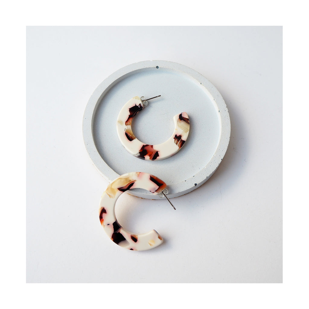 These beautiful mid sized hoop earrings are made from hand polished petroleum free cellulose acetate in a beautiful cocoa honey and cream marble mix. The perfect statement hoop earring.