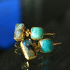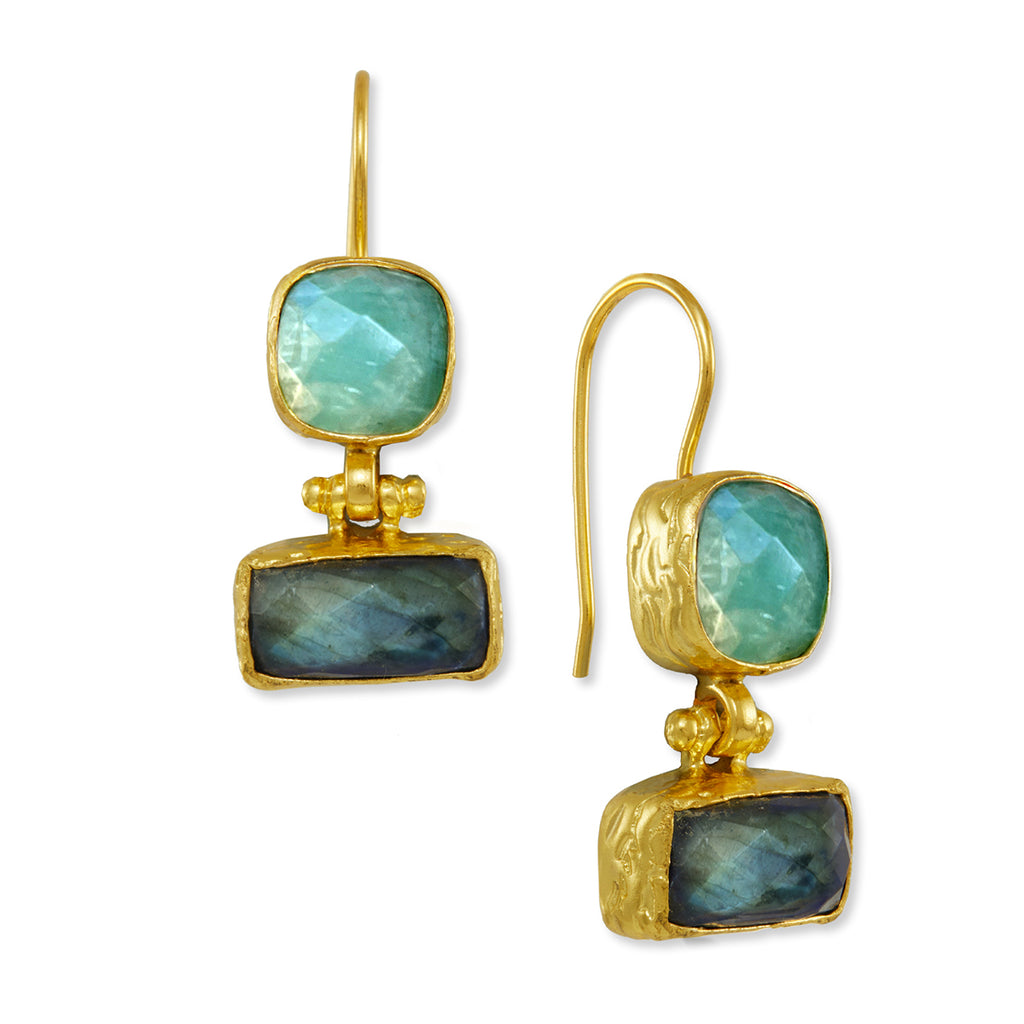 The Nerissa earrings are handcrafted from sustainable 21ct gold-plated recycled brass and is set with semi-precious gemstones including labradorite and aqua chalcedony, a stunning contrast of colours that showcase the natural hues of these semi-precious stones.