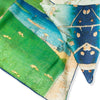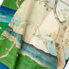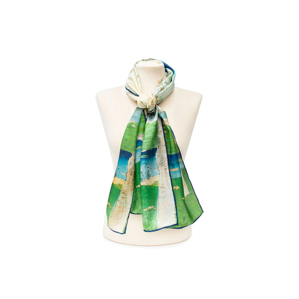 A gorgeous green, blue and cream 100% silk scarf featuring a picturesque Japanese riverside scene.