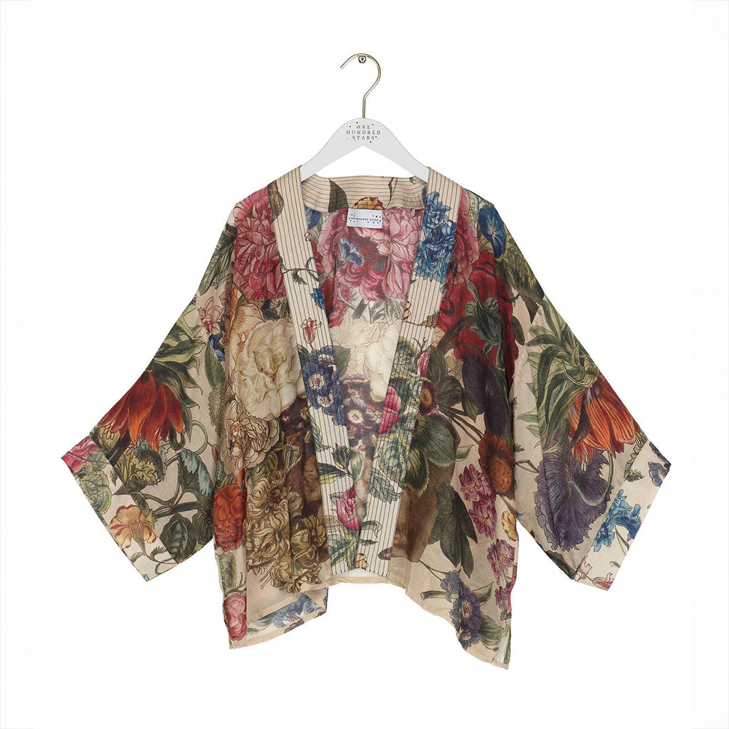 This kimono features a design inspired by the Dutch Old Masters, highlighting fine details and a lively palette of rich colours. A mix of primroses, auriculas, and polyanthus flowers come together to form a beautiful floral arrangement.