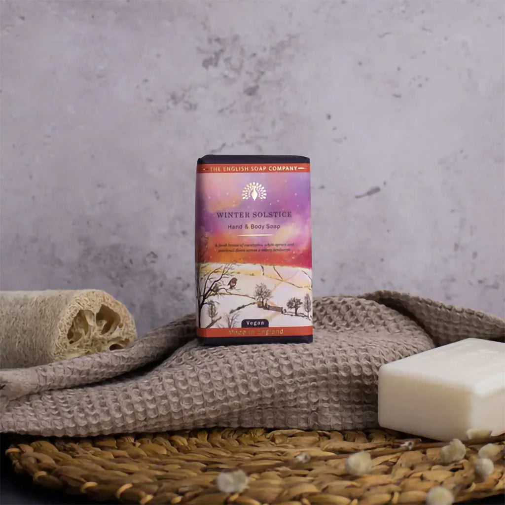 A luxury vegan soap bar. enriched with shea butter and fragranced with notes of white spruce, eucalyptus, lime, pine, amber and patchouli. Suitable for both hands and body. This winter solstice soap is like a fresh breeze floating across a snowy woodland landscape.