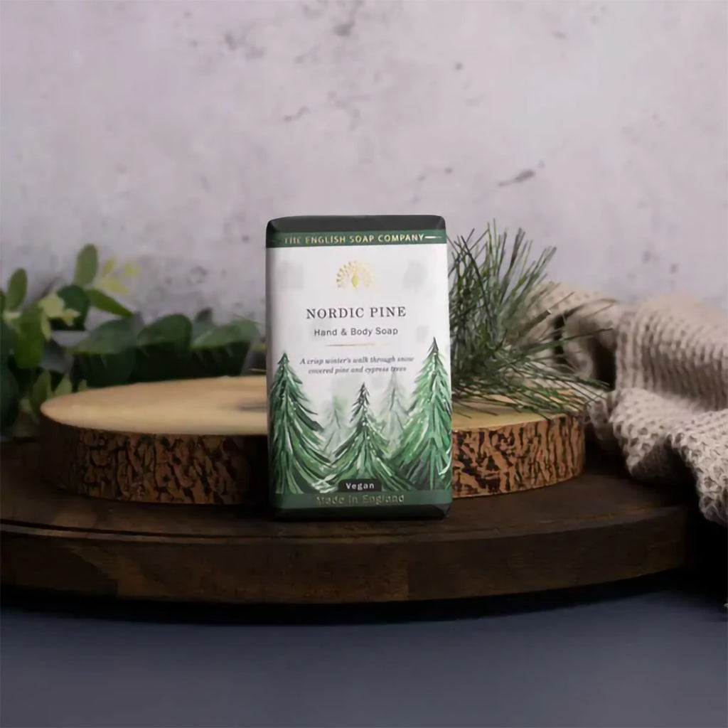 A luxury vegan soap bar. enriched with shea butter and fragranced with notes of pine, frankincense, cinnamon, sandalwood and vanilla. Suitable for both hands and body. This Nordic pine soap smells of crisp winter walks through snow covered pine and cypress trees.