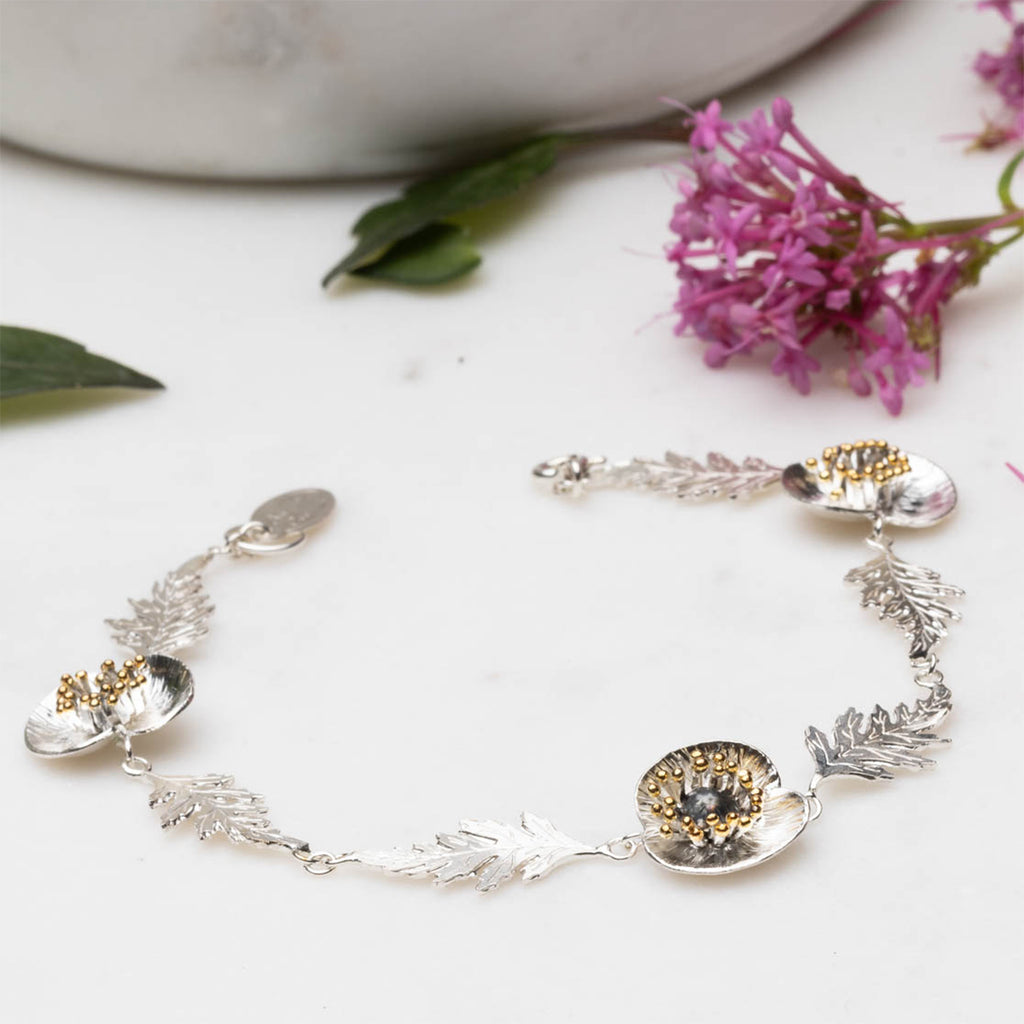 Handmade in the UK from 925 sterling silver with black oxidised accents and gold-plated details, this bracelet features three poppy blooms and six leaves. At 18cm, it's designed for daily wear and arrives beautifully packaged in an Amanda Coleman branded gift box.