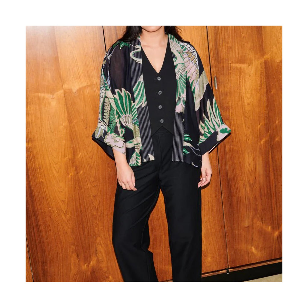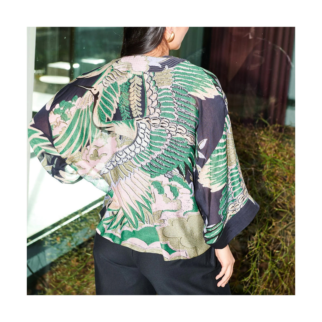 An elegant kimono jacket with flowing three-quarter sleeves and an open front, accented by subtle lapel embroidery. Graceful cranes rendered in sand, pink, and emerald sweep across a deep, nearly black emerald green backdrop, a sophisticated choice for layering through the colder months.