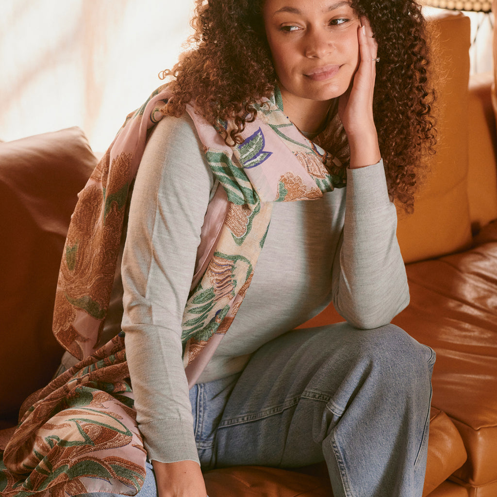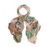 Symbolising good fortune and longevity, this Crane scarf design is a perfect addition to your wardrobe. These large, graceful cranes in jade, stone and camel, green fly across a plaster pink background.