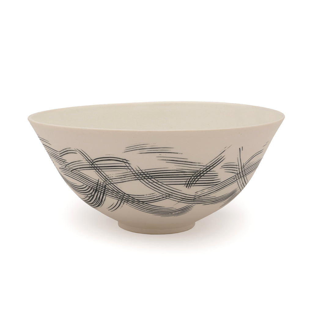 The Wild Wave collection by Julie Peel Ceramics is a reflection on her connection with the North Sea of her childhood, and the wildness of that coastline. The distinctive design is created by incising leather-hard porcelain with the wave design and inlaying black slip. The piece is then bisque fired to about 980C before applying a smooth opaque matte white glaze to the inner surface. The glaze used reflects the beautiful white inner surfaces of shells commonly found on UK shores such as cockles, winkles and whelks. After glaze firing the external incised surface is diamond-polished giving a gorgeously silky finish, just like sea-washed pebbles.