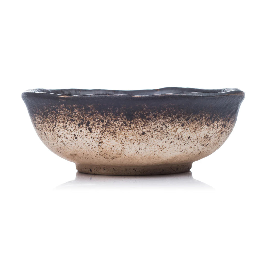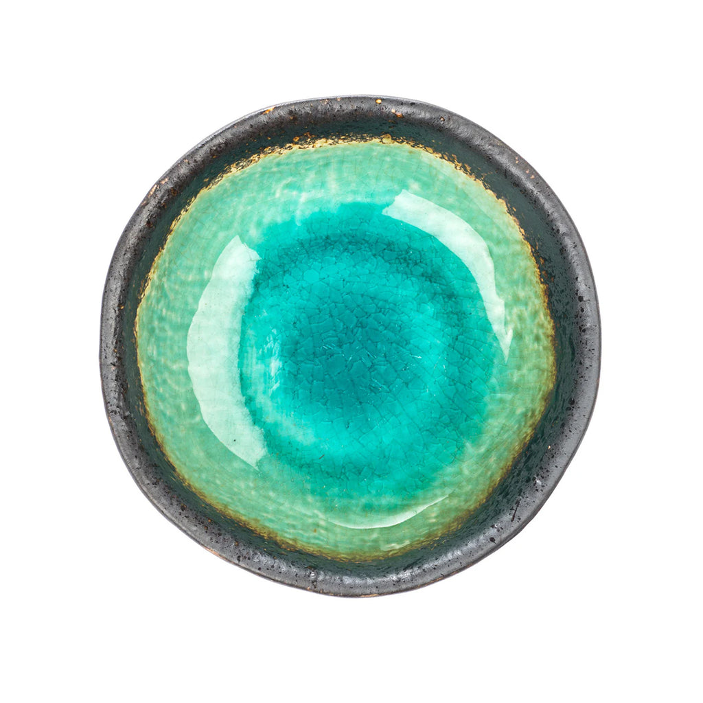 This Japanese Crackle Glaze Bowl boasts a stunning sea blue-green cracked-glass glaze and brown feathered edging. With its authentic design and perfect size for pickles, dips, and small starters, it is a must-have for any kitchen.