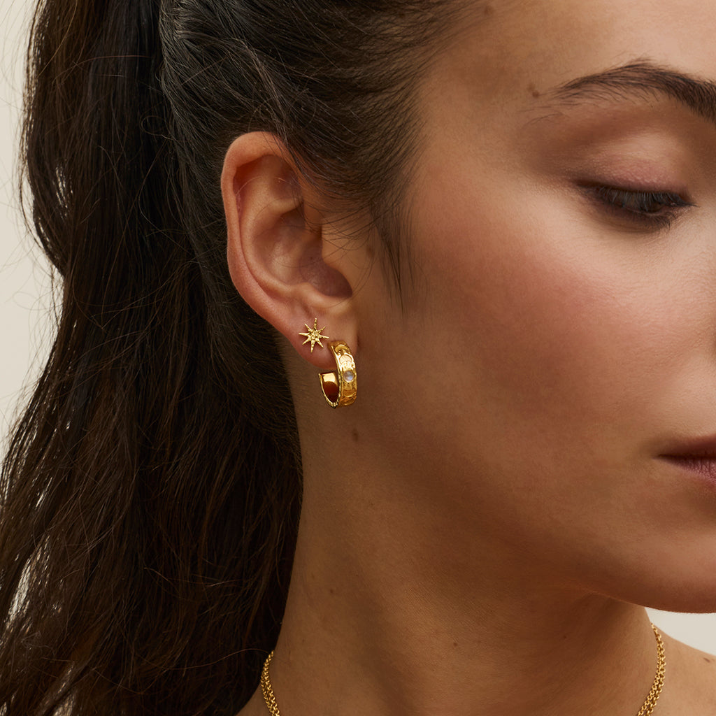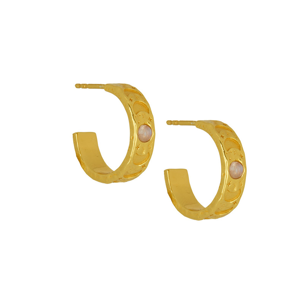 Made from 18ct gold-plated recycled brass, these celestial hoops feature white moonstone drops, a gemstone known to calm the spirit and enhance intuition.