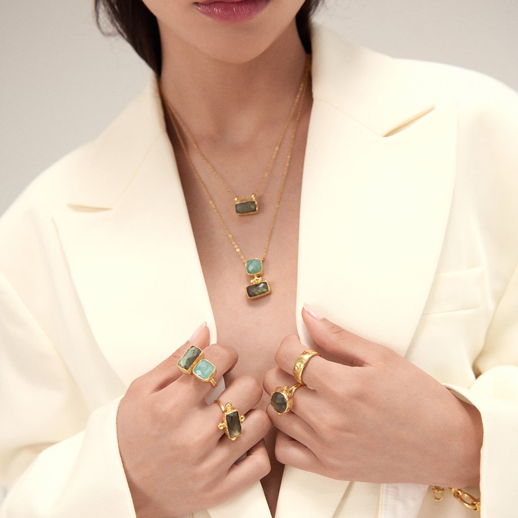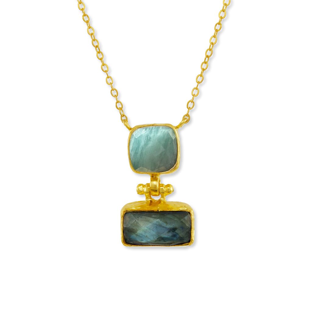 The Nerissa pendant necklace is handcrafted from sustainable 21ct gold-plated recycled brass and is set with semi-precious gemstones including labradorite and aqua chalcedony, a stunning contrast of colours that showcase the natural hues of these semi-precious stones.