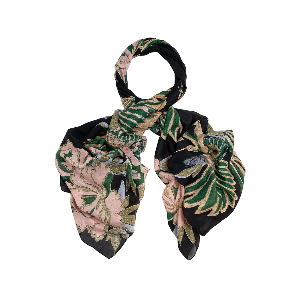 Symbolising good fortune and longevity, this emerald green Crane scarf design is a perfect addition to your autumn and winter wardrobe. These large, graceful cranes in sand, pink and emerald, green fly across a nearly black base