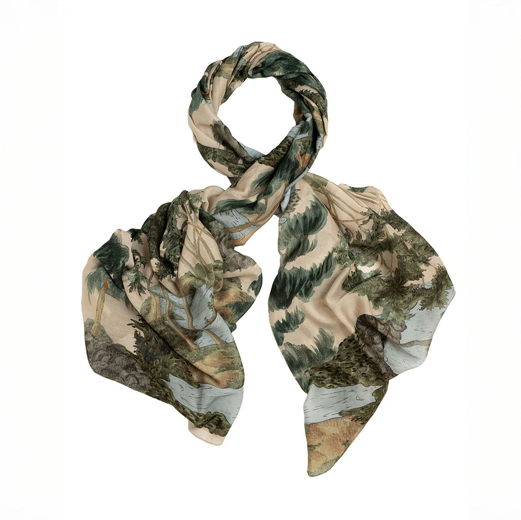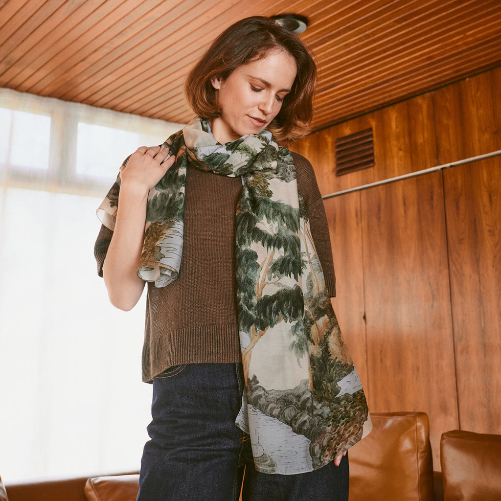 This gorgeous scarf design depicts hand drawn illustrations of different types of trees set around natural pools and rivers. The green and grey watercolours give this print a dreamy, faded quality of a classic print.