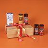 The selection of treats is presented in a reusable presentation box and hand tied with a decorative red ribbon.