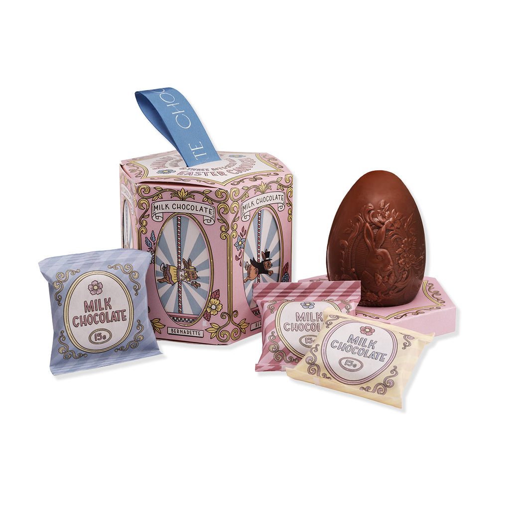 A charming gift box of premium chocolate treats, with a milk chocolate egg and three bite-sized bars, perfect for Easter presents. Comes beautifully packaged in a circus-themed hexagonal box in colourful pastels, in-keeping with the chocolate carousel theme, with decorative illustrations all over featuring Barnaby Bunny and all his friends taking a ride on the carousel of chocolate.