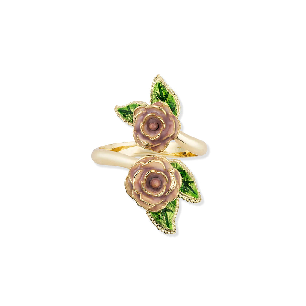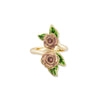 This adjustable ring features an elegant design of vintage inspired pink roses, turned into a wearable work of art. 14ct gold plated and hand-enamelled with precision and care.