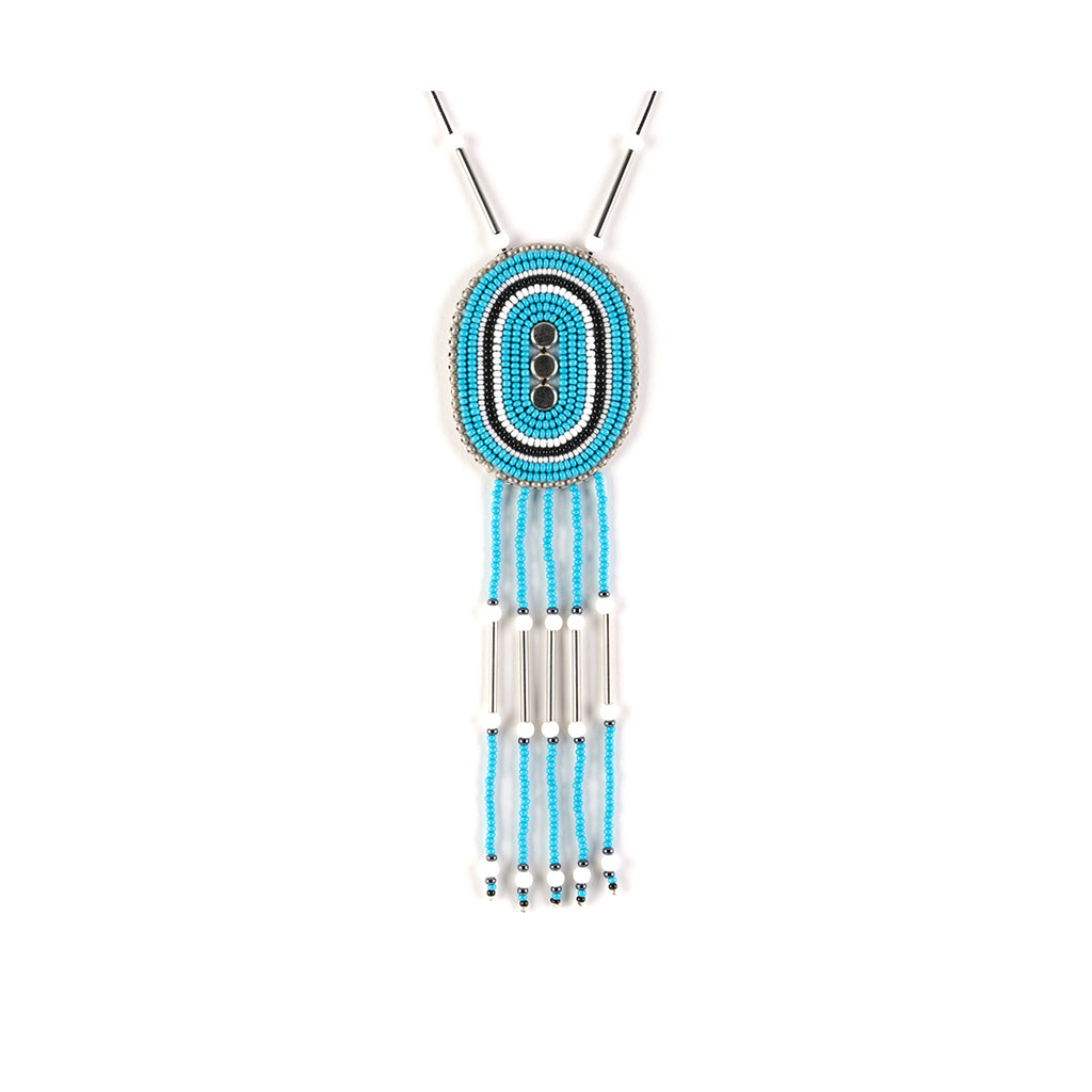 Crafted by Galina Veretnova, the Evenki Oval Amulet is handcrafted with Czech glass beads and a reindeer hide backing. This traditional amulet from Evenki shamanic traditions is believed to safeguard the wearer's spiritual health.