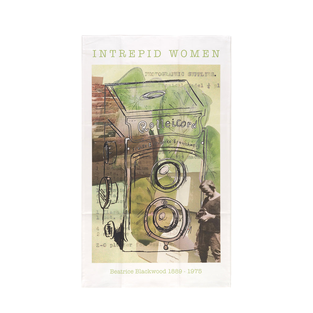 Premium white cotton tea towels with a hanging loop. Printed belly band with biographical details of each intrepid woman.
