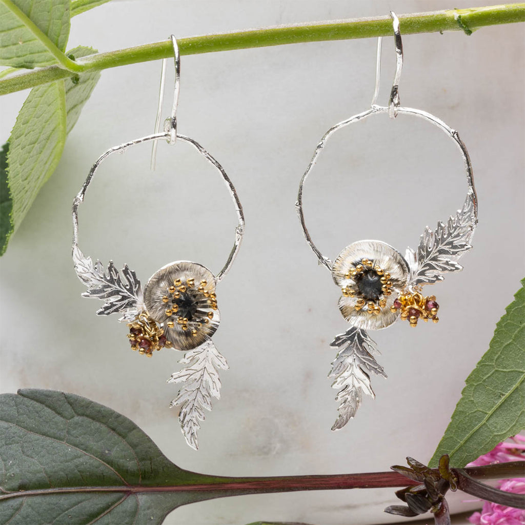 Created in the Amanda Coleman workshop, The distinctive poppy leaf gracefully frames the flower, adding a natural touch, while a delicate cluster of red garnet beads and flowers offsets the design. This thoughtful detail pays homage to the red poppies associated with the First World War, making these earrings not only a stunning accessory but also a meaningful tribute.