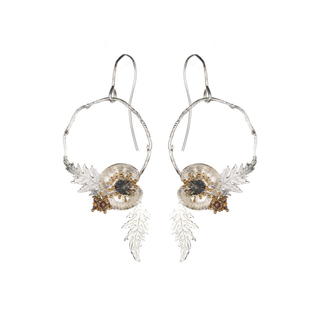 Turn heads with these sculptural statement poppy flower drop earrings, meticulously crafted in solid 925 sterling silver. Each piece combines a finely detailed poppy bloom with a graceful cast silver twig circular frame, delivering botanical-inspired jewellery that balances artistry with wearable elegance.